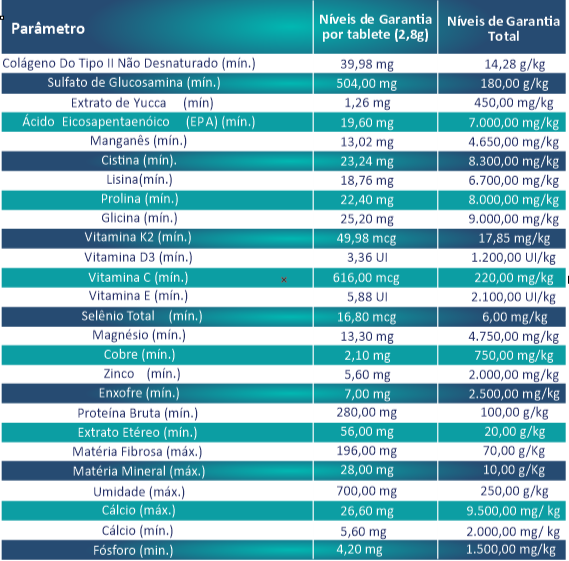 Colágeno Tipo II Não Desnaturado, Sulfato de Glicosamina, Extrato de Yucca (Yucca schidigera), Óleo de Peixe Refinado, Sulfato de Manganês, L-Cistina, L-Lisina, L-Prolina, L-Glicina, Vitamina K2, Vitamina D3, Vitamina C, Vitamina E, Transquelato de Selênio, Sulfato de Magnésio, Sulfato de Cobre, Sulfato de Zinco e Transquelato de Enxofre, Plasma Sanguíneo Desidratado, Hemoglobina Desidratada de Bovino, Hidrolisado de Fígado de Suínos, Fressura de Suínos, Quirera de Arroz, Farelo de Trigo, Fosfato Bicálcico, Cloreto de Sódio, Glicerina, Açúcar de cana-de-açúcar, Nitrito de Sódio, Ácido Cítrico, Tripolifosfato de Sódio, DL-Alfa-Tocoferol, Propionato de Cálcio, Ácido Pirolenhoso, Sorbato de Potássio e Eritorbato de Sódio, Extrato de Cravo da Índia (Caryophyllus aromaticus), Óleo de coco (Cocos nucifera).