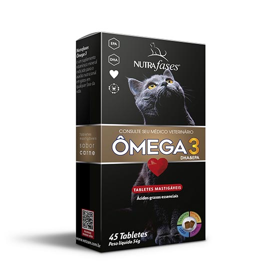 Nutrafases Ômega 3 Indicado para gatos em qualquer idade ou fase da vida. É um multi suplemento alimentar, que contém NanoÔmega 3 e o ômega 3 micronizado, extraído do óleo de peixe de águas frias, ricos em DHA e EPA e vitamina A. Sua apresentação em tabletes mastigáveis sabor carne facilita a administração, pois não possui odor e sabor forte de peixe. O ômega 3 é um ácido graxo essencial, que não pode ser sintetizado pelo organismo dos gatos, dessa forma devem ser ingeridos através da dieta ou suplementação.
