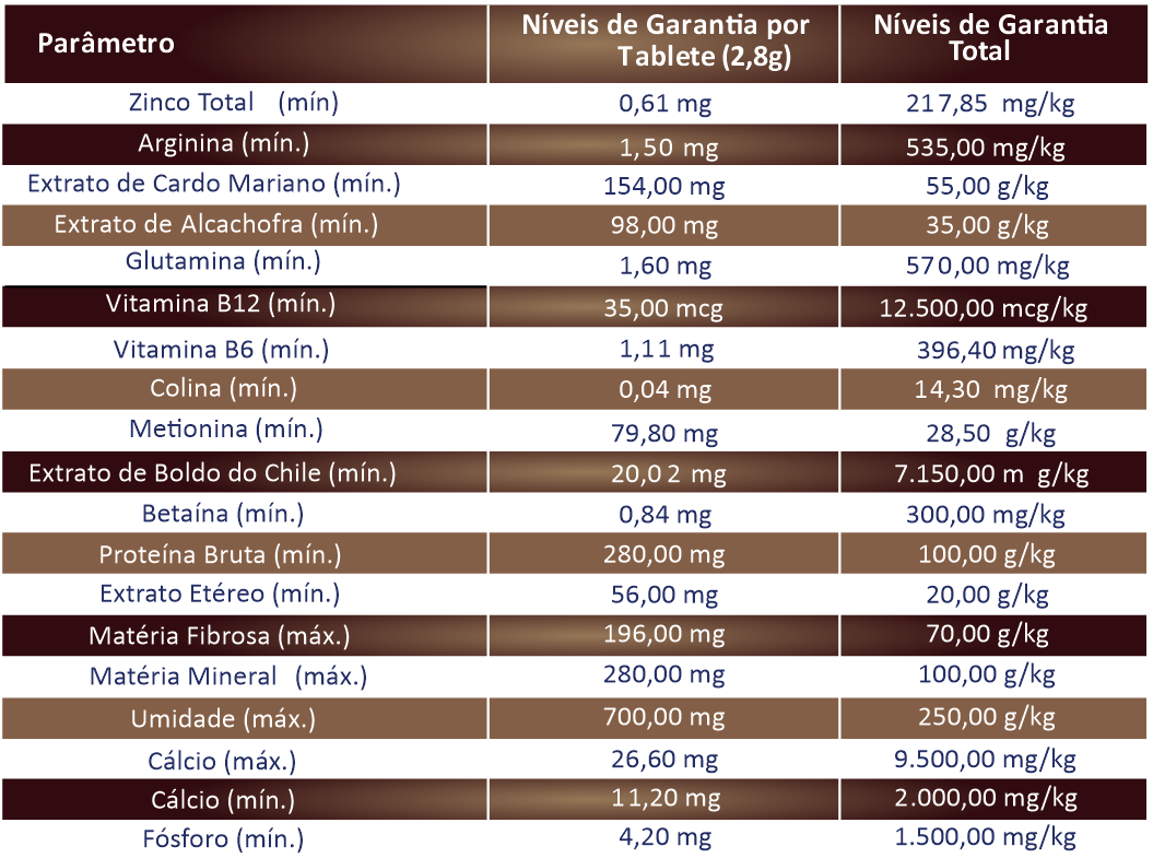 L-Arginina, L-Metionina, Zinco Aminoácido Quelato, Plasma Sanguíneo Desidratado de Bovino, Cloridrato de Betaína, Extrato de Cardo Mariano (Silybum Marianum) 5,5%, Extrato de Alcachofra (Cynara cardunculus subsp scolymus), Extrato de Boldo do Chile (Peumus boldus), L-Glutamina, Vitamina B6, Vitamina B12, Cloreto de Colina , Hidrolisado de Fígado de Suínos, Fressura de Suínos, Quirera de Arroz, Farelo de Trigo, Fosfato Bicálcico, Cloreto de Sódio, Glicerina, Açúcar de cana-de-açúcar, Nitrito de Sódio, Ácido Cítrico, Tripolifosfato de Sódio, DL-Alfa-Tocoferol, Propionato de Cálcio, Ácido Pirolenhoso, Sorbato de Potássio, Eritorbato de Sódio, Extrato de Cravo da Índia (Caryophyllus aromaticus) e Óleo de coco (Cocos nucífera).