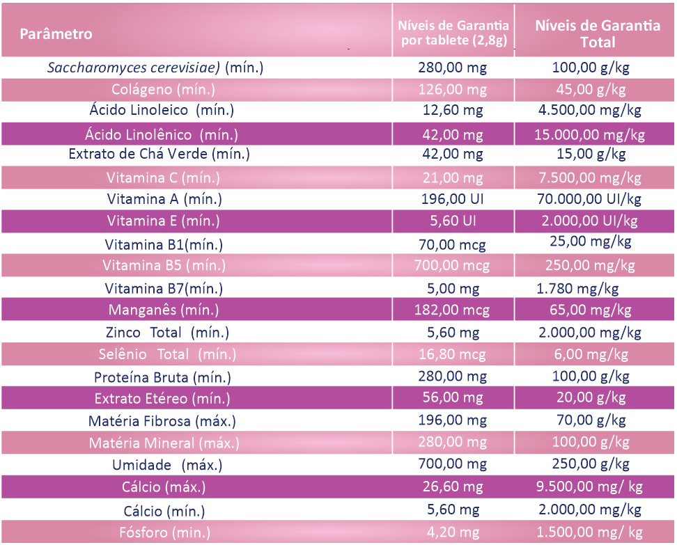 Levedura de Cervejaria (Saccharomyces cerevisiae), Colágeno Hidrolisado, Óleo de Linhaça (Linum usitatissimum), Extrato de Chá Verde (Camelia sinenses), Vitamina C, Vitamina A, Vitamina E, Vitamina B1, Vitamina B5, Vitamina B7, Sulfato de Manganês, Zinco Aminoácido Quelato, Selênio Aminoácido Quelato, Hidrolisado de Fígado de Suínos, Fressura de Suínos, Quirera de Arroz, Farelo de Trigo, Fosfato Bicálcico, Cloreto de Sódio, Glicerina, Açúcar de Cana-de-açúcar, Nitrito de Sódio, Ácido Cítrico, Tripolifosfato de Sódio, DL-Alfa-Tocoferol, Propionato de Cálcio, Ácido Pirolenhoso, Sorbato de Potássio e Eritorbato de Sódio, Extrato de Cravo da Índia (Caryophyllus aromaticus), Óleo de coco (Cocos nucifera).