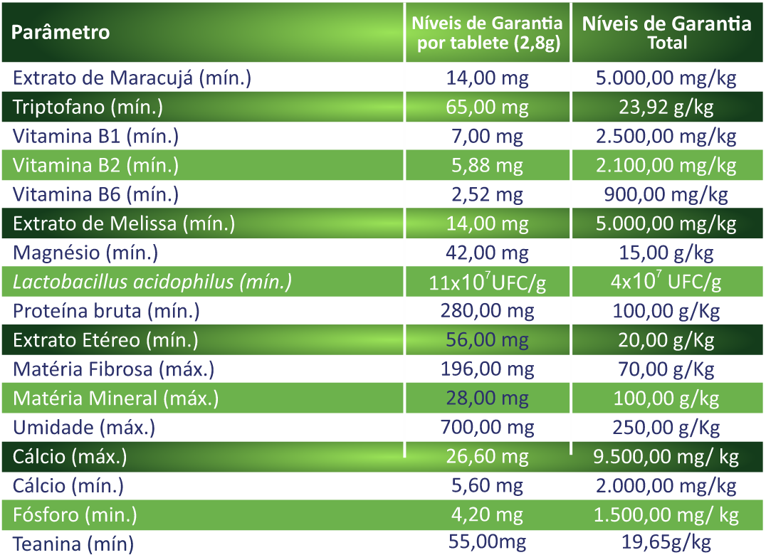 Extrato de Maracujá (Passiflora edulis – 0,50%), L-Triptofano, Vitamina B1, Vitamina B2, Vitamina B6, Extrato de Melissa (Melissa officinalis – 0,50%), L-Teanina, Magnésio Aminoácido Quelato, Saccharomyces cerevisiae, Enterococcus faecium, Lactobacillus acidophilus, Extrato de Camomila (Matricaria chamomilla), Hemoglobina Desidratada de Bovino, Hidrolisado de Fígado de Suínos, Fressura de Suínos, Quirera de Arroz, Farelo de Trigo, Fosfato Bicálcico, Cloreto de Sódio, Glicerina, Açúcar de cana-de-açúcar, Nitrito de Sódio, Ácido Cítrico, Tripolifosfato de Sódio, DL-Alfa-Tocoferol, Propionato de Cálcio, Ácido Pirolenhoso, Sorbato de Potássio, Eritorbato de Sódio, Extrato de Cravo da Índia (Caryophyllus aromaticus) e Óleo de Coco (Cocos nucifera).
